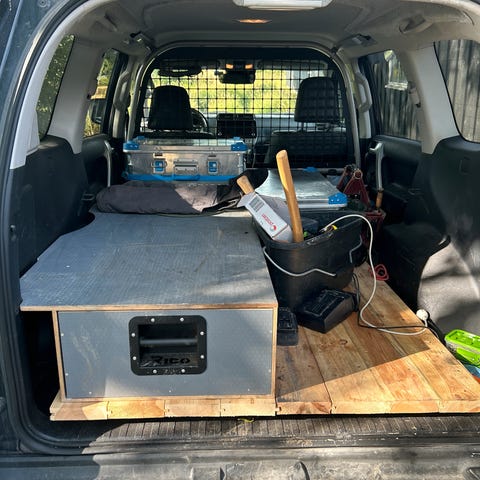 Loyds Smartfloor bilinnredning med stor flat lasteflate og integrert skuff. Egnet for organisering og sikring av utstyr i bilens bagasjerom. Materiale og farge er svart. Passer for bruk på Toyota landcruiser.