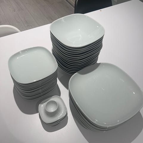 Ikea-servise med 4 middagstallerkener, 6 små tallerkener og 5 skåler. Kan sendes, eller leveres/hentes mellom Imsland og Haugesund.