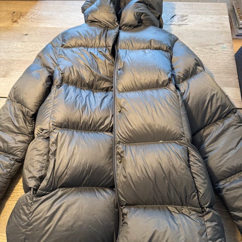 Jakken har hette og glidelåslukking, laget av dun som gir varme og isolasjon.