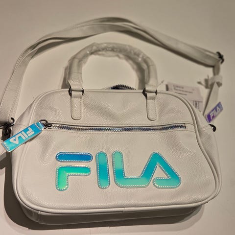 Fila dameveske laget av kunstlær med hvit base og rosa detaljer. Vesken har både håndtak og justerbar skulderrem, samt glidelåslukking.