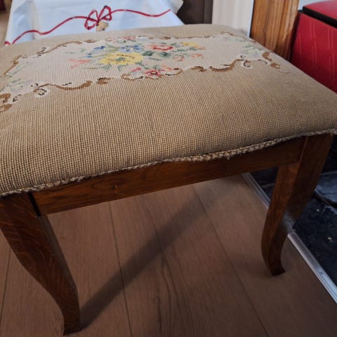 Er hel, men noe skjev og har selvfølgelig noe naturlig patina og enkelte tråder sånn har sprukket litt (se bilder).