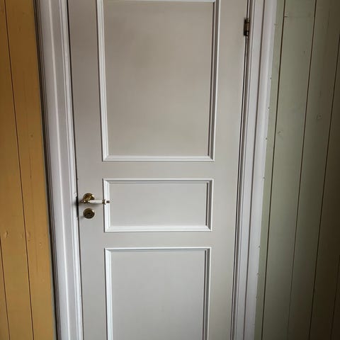 Dør som ny. Demontert pga bruker ikke. Tung dør uten karm. Dørbladet er for dør 90x200. Håndtaket følger med.