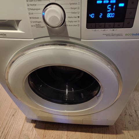 Veldig fin stor vaskemaskin Samsung EcoBubble 8/6kg. med tørkefunksjon. I veldig god stand. Alt fungerer som det skal. Selges til lav pris. Kan leveres.