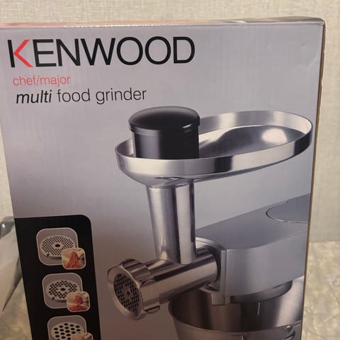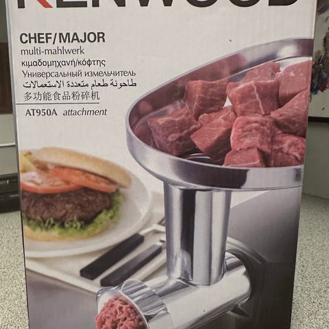 Ubrukt Kenwood AT950A Multi Food Grinder tilbehør for kjøkkenmaskin. Laget av rustfritt stål, designet for å male og male kjøtt og andre matvarer. Passer til Kenwood kjøkkenmaskiner med kompatibel tilkobling.