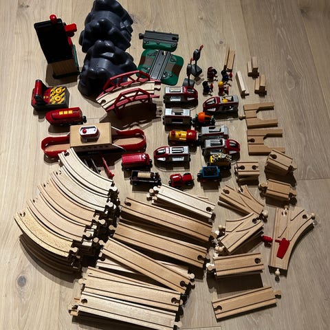 BRIO Togsett i tre med ulike tog, skinner og tilbehør. Egen stasjon for å løfte tunge last av togene.