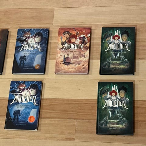 Amuletten bokserie bestående av flere fantasybøker. Serien inkluderer titler som Ildfuglen, Flukten fra Lucien, Alveprinsen, Det hemmelige rådet, Øyen bak skyene, Steinvokterens forbannelse og Steinvokteren. Bøkene har varierende farger på omslaget og er samlet i en serie med samme tema.