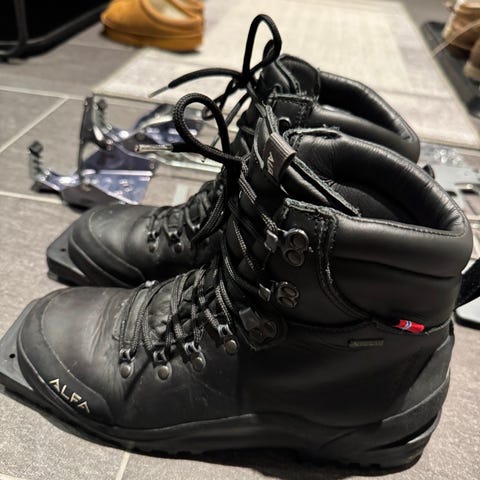 Selger et par Alfa fjellskistøvler i størrelse 40. Dette er solide og komfortable støvler laget for fjell- og markaski, kjent for god passform og kvalitet.