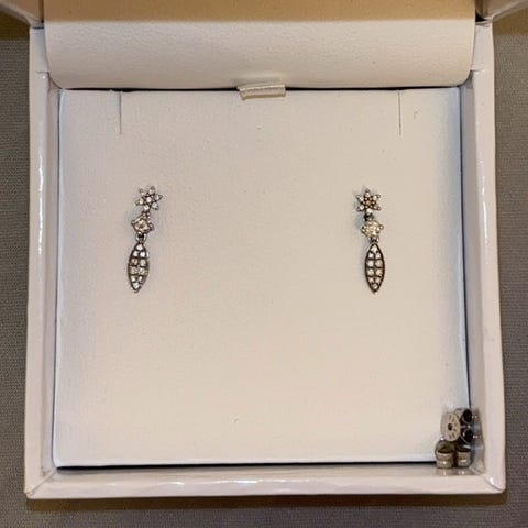 Diamantøredobber i hvitt gull, kun brukt et par ganger. Diamantbevis medfølger.