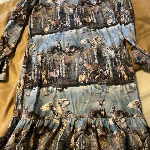 Myke og varm morgenkåpe med dinosaur design. Den nederste knappen er knekt (se bilde). Passer ca 6-8 år.