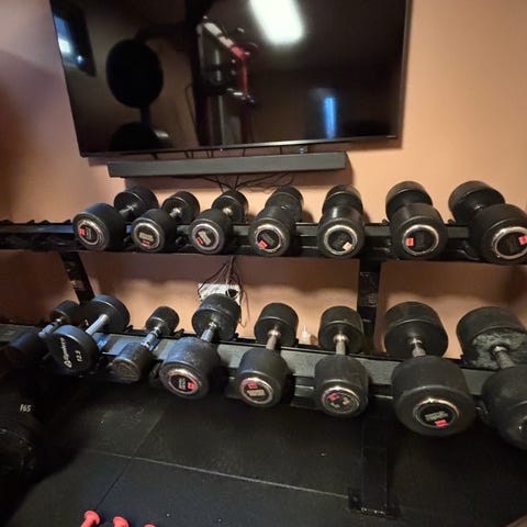 Stativ til dumbbell i metall. Designet for oppbevaring og enkel tilgang.