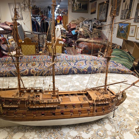 Modellskip laget i tre, utformet som en seilskute med detaljerte master og rigging. Passer som dekorasjon eller samlerobjekt.