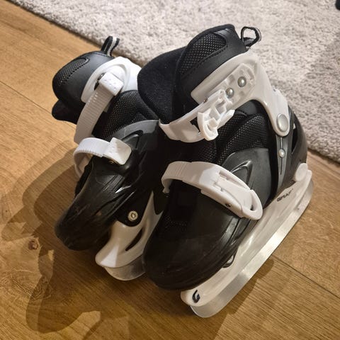 Graf Ishockey justerbare skøyter i størrelse 30-33 for barn. Skøytene har justerbare stropper og en kombinasjon av svart og hvitt materiale. Brukt i fjor vinter av ett barn, vi kjøpte de nye. Pent brukte skøyter 😊