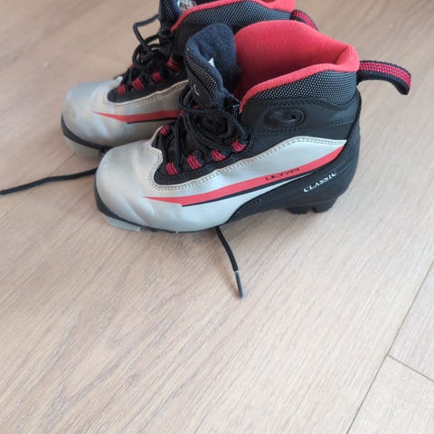 Skisko fra Classic størrelse 32 selges. De er litt små i størrelsen, men 32 er det som står inni. Slitte på tuppene begge to, men fungerer fint. Er kun knyting på begge, og den ene lissen er ganske slitt.
