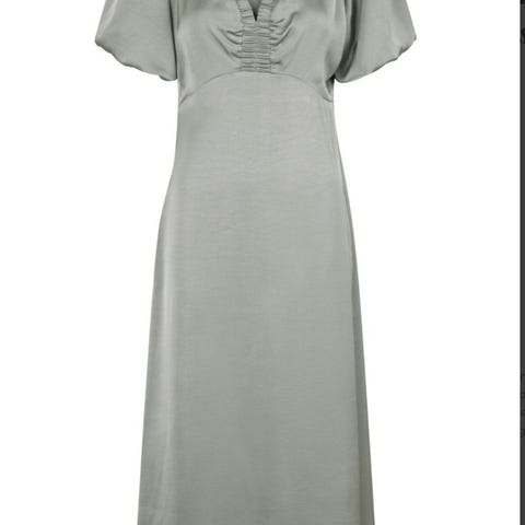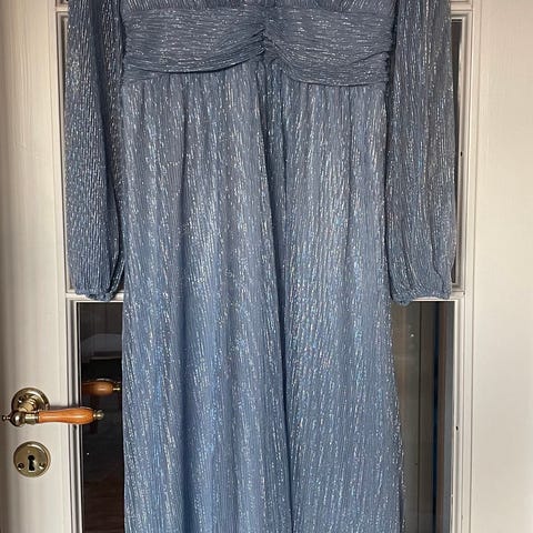 Neo Noir Festkjole i størrelse M, farge gull. Kjolen har lang erm og dyp V-utringning og omslag, egnet for formelle anledninger.