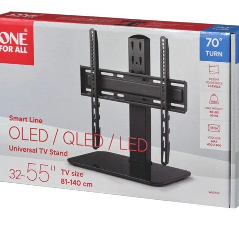 Dette One For All universalstativet passer for flatskjermer med størrelse mellom 32" og 65". Det elegante tredesignet og 360°-svingning sikrer at du kan se TV fra alle vinkler, og at stativet alltid tar seg godt ut. Selges grunnet overgang til tv-plassering på vegg. Nypris 3000,-