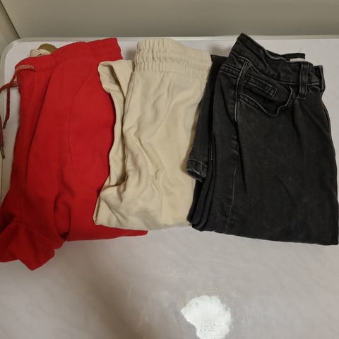 Pakke med ulike barneklær for jente i størrelse 146. Inkluderer gensere, t-skjorter, shorts og bukser i forskjellige farger og mønstre. Materialer og merker varierer. Selges samlet. Noe er lite brukt