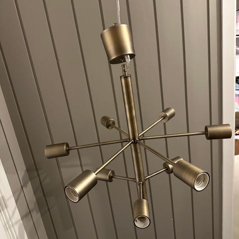 Flott taklampe med 6 pærer . Pærene som er i, følger med. Gir et flott lys. Det finnes flere farger og former på pærene, om ønsket variasjon. Jeg har kjøpt pærene på europris .