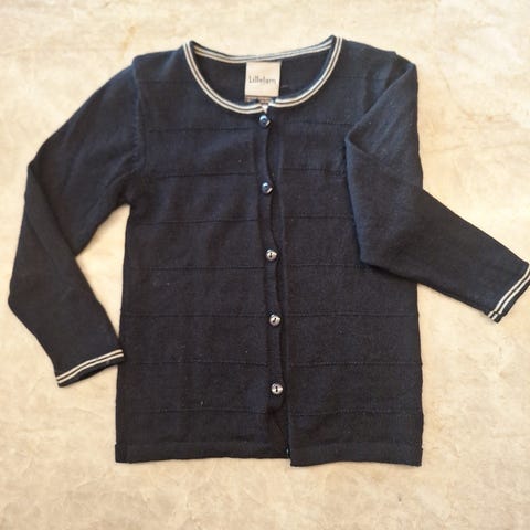 Lyng farget cardigan fra Lillelam i størrelse 92cm i merino ull. Har et hull som ikke er sydd på venstre arm foran og mangler en knapp. Ellers hel og fin. Pent og lite brukt.