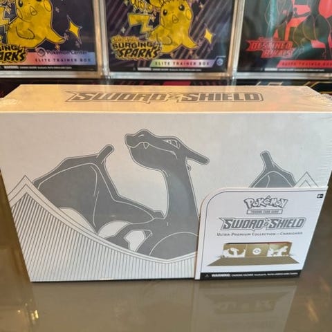 Selger sealed Pokemon Sword & Shield UPC Zacian & Zamazenta. Inneholder blant annet 16 pakker fra Sword & Shield era og et gullkort av både Zacian og Zamazenta.