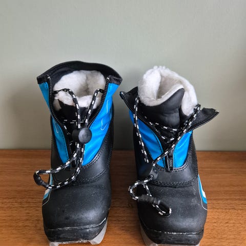 Skisko størrelse 27 selges, noe små i størrelsen. Merket er Frost, og de er turkise med en figur som synes på siden. Litt slitte på den innerste flappen, men det synes ikke når skoene lukkes. Veldig praktiske til barn da det kun er strikk innerst, og deretter glidelås og borrelås, så ingen snøring.
