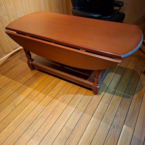 Godt og solid bord, men synlig brukt. Tåler godt flere omganger med pussemaskin eller maling, men vi har likt sjarmen med bruksmerkene.