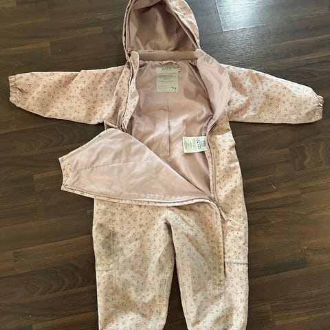 Wheat regndress med litt vattert fôring i størrelse 92, farge rosa, laget av polyester. Dressen har hette, elastiske mansjetter ved armer og ben, og innvendig fôr med mønster.
