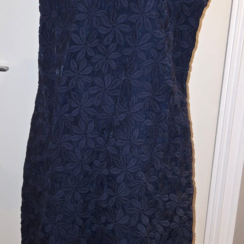 Vila festkjole i blå farge, størrelse 34 for damer. Laget av polyester materiale. Kjolen har blonder på overdelen og et langt skjørt med tyll. Den har bare blitt brukt en gang, så den er sny! Selges fordi den bare blir liggende.