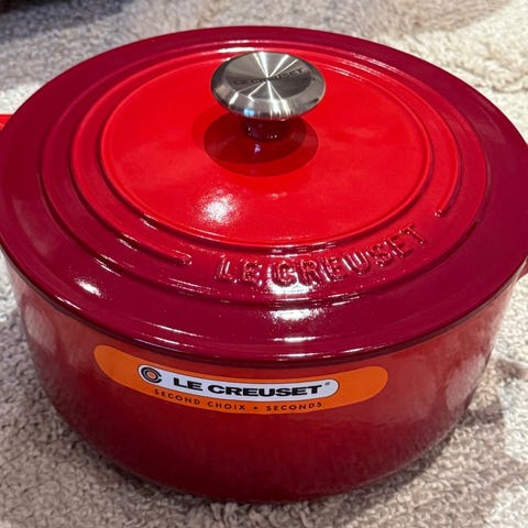Le Creuset gryte i rød emaljert støpejern med lokk og to håndtak. Egnet for matlaging på komfyr og i ovn. Helt ny uten eske.
