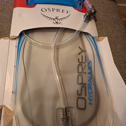 Osprey drikkeblære på 2,5 liter. Litt misfarget av sola, men har ingenting å si for bruken. Fungerer som den skal. Legger ved utstyr til å vaske slangen og blæren på kjøpet.