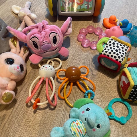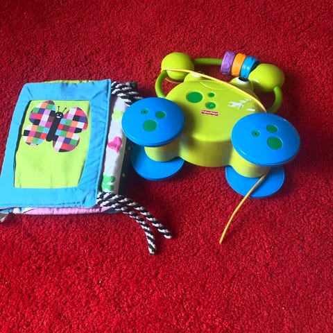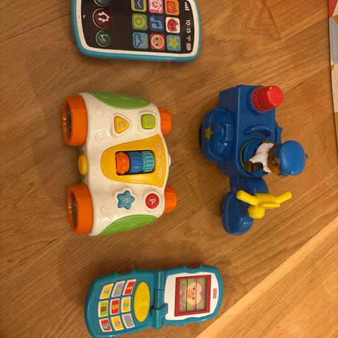 Fisher-Price hammerleker med fargerike former og et sorteringsleketøy med forskjellige geometriske former og en figurleke. Lekene er laget i tre og plast, designet for små barn. Lekene har blitt lekt godt med og er i veldig god stand med mye lek igjen.