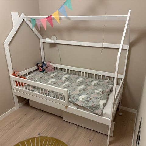 Denne sengen har ikke blitt brukt til å sove i, vært mere til pynt. Det er likevel litt bruksmerker som kan males over. Madrass følger meg.