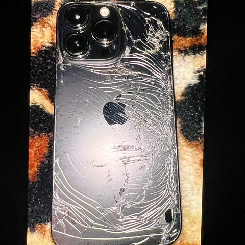 Apple iPhone 14 Pro mobiltelefon med 128 GB lagringskapasitet. Enheten har en svart farge og viser tegn på bruk med sprekker på baksiden. Batterikapasiteten er 88 %.