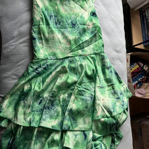 Sort playsuit i strechy materiale. Str L på lappen, men sitter som en M. Playsuiten har en feminin silhuett med innsvinget midje med strikk og lett utsvingte ben. Smale, justerbare stropper og blonde-stoff bak. Lite brukt.