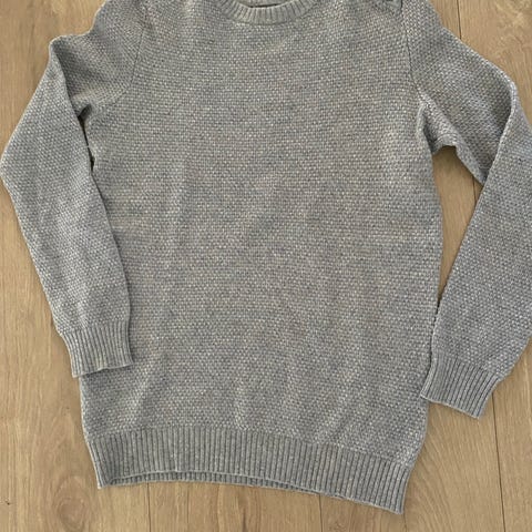 Genser i lammeull 80% og nylon 20 %. Klassisk snitt. Pen blåfarge og semskede lapper i lys brun på albuene .