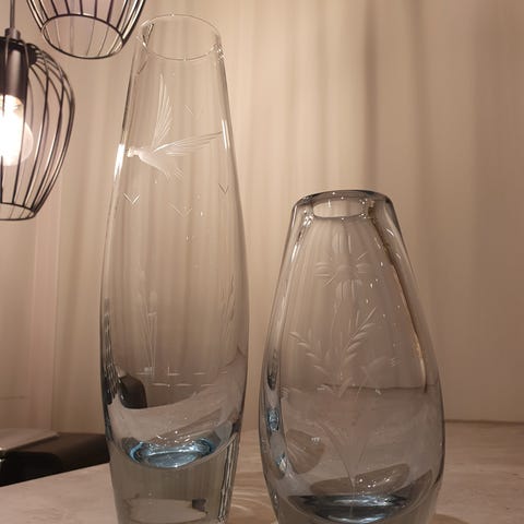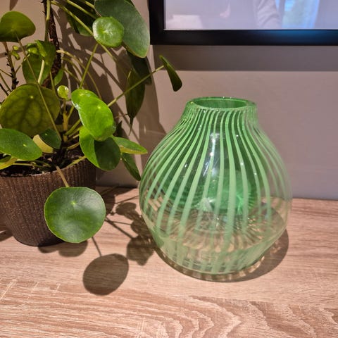 Grønn glass vase med stett. Tatt noen bilder med blits og noen uten, så en får sett grønn fargen skikkelig. Meget flott, har selv brukt den til å ha vinkork opp i.