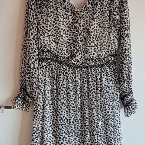 Donna kjole i størrelse 40 med leopardmønster. Kjolen har lange ermer med elastiske mansjetter og et belte i midjen for justering. Materialet er lett. Kan brukes til fint og til hverdags.