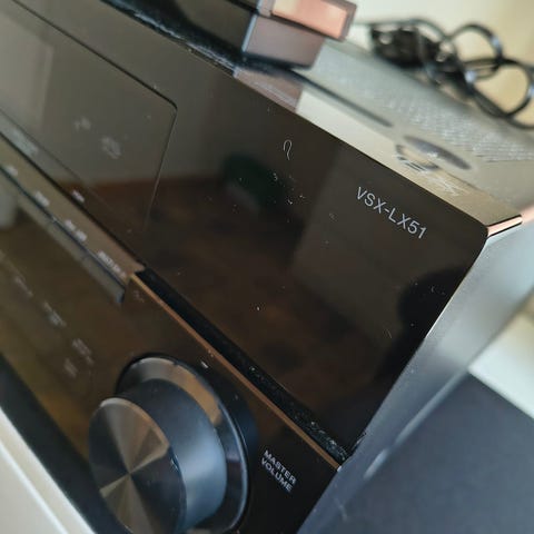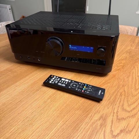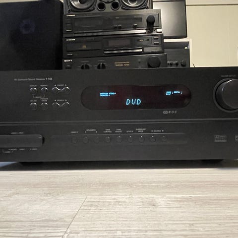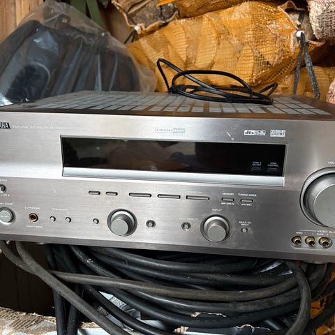 Yamaha RX-V461 Surround Receiver med flere tilkoblinger på baksiden, inkludert HDMI, komponent, og lydinnganger. Enheten har en sølvfarget finish og flere kontrollknapper på frontpanelet. Egnet for hjemmeunderholdningssystemer som krever surroundlyd.