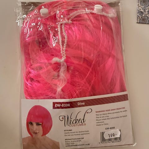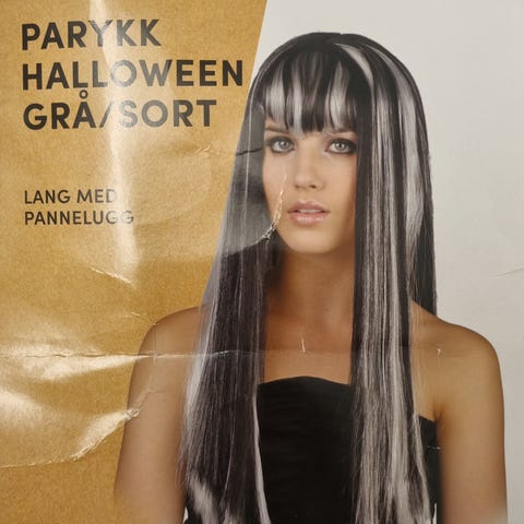 Maske til utkledning med grått og svart hår. Masken har detaljer i rødt og grønt. Selges 90kr