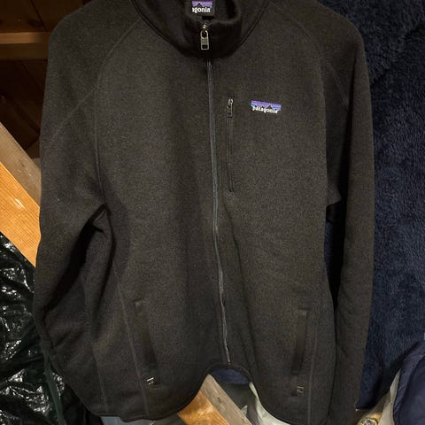 Patagonia fleecejakke i størrelse S for herre. Jakken er svart og laget av fleece materiale. Den har hel glidelås og høy krage.