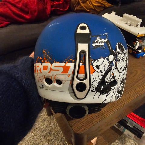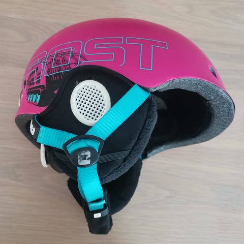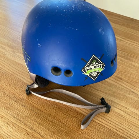 Frost Edge S slalåmhjelm i blå og oransje farger. Hjelmen har justerbar stropp og ventilasjonshull. Størrelse S (50-54cm)