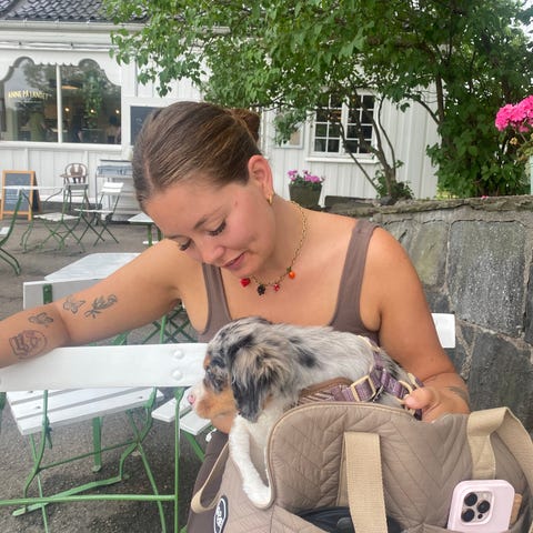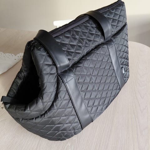 Sort bæreveske med nettingvinduer på en langside og begge kortsidene for ventilasjon. Utstyrt med skulderrem og håndtak for bæring. Inneholder feste for å sikre hunden. Passer til transport av hund/ katt eller andre små dyr. Også til flytransport inne i kabinen. Lite brukt, kun fraktet to valper med fly på innenlands rute. (ingen tisseuhell).