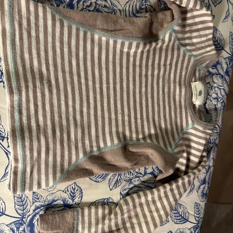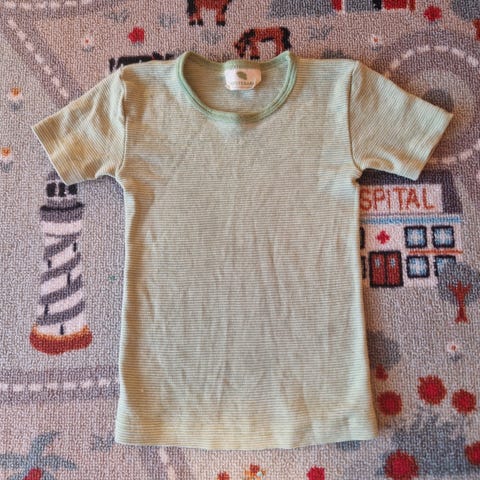 Nøstebarn ull singlet i størrelse 104. 70% ull, 30% silke. En del nupper på ryggen, på innsiden. Siste bilde er av stoffet bak, på vranget.