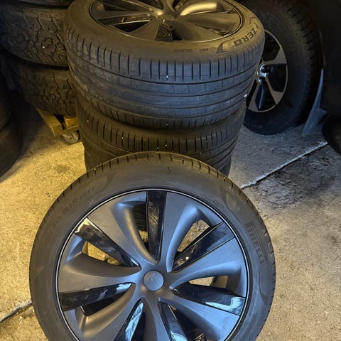 Pent brukte felger. Dekk for en sesong igjen. Rimblades og trykksensorer. Brukt på Tesla model y liten transportskade(se bilde) lagt 2 kag med coating i sommer.