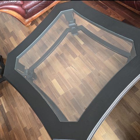 Selger to nydelige og solide salongbord i mørkt treverk med dekorative utskjæringer og glassplate i midten. Tidløst design som passer godt både i klassiske og mer moderne stuer.