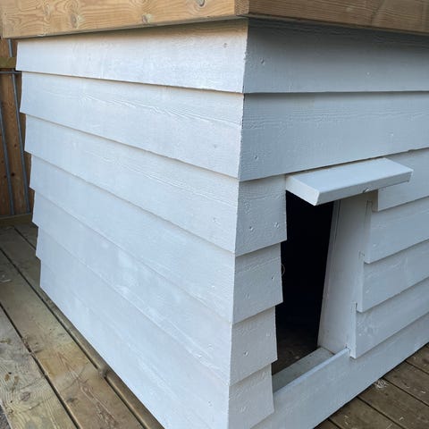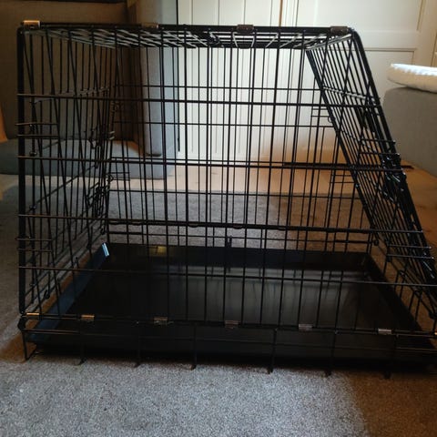 Robust og romslig hundebur i metall for store hunder. Uttakbar plastbunn, nylig rengjort og behandlet med økologisk pleieolje. To dører gir enkel tilgang. Stabil konstruksjon – perfekt både hjemme og i bil.