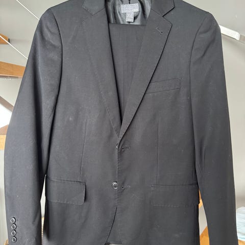 H&M dressjakke og bukse for herre i størrelse 48.- slimfit. Dressen er svart og laget av polyester. Hvit slimfit skjorte str s 100kr