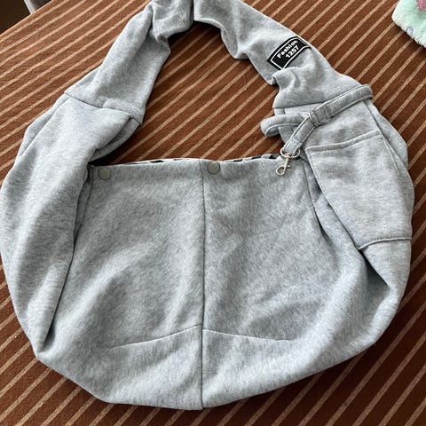 Skulderveske i grå og rød. Designet for enkel bæring over skulderen. Vi har brukt den til chihuahua.