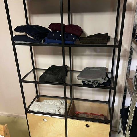 Elegant og tidløs veggseksjon med sort metallramme og glasshyller. Hyllesystemet har et luftig og moderne uttrykk, og passer perfekt til butikk og næring, kontor, walk-in closet eller showroom. Glasshyllene gir et lett uttrykk og egner seg godt til oppbevaring og utstilling av bøker, dekor, sko, vesker eller pyntegjenstander.