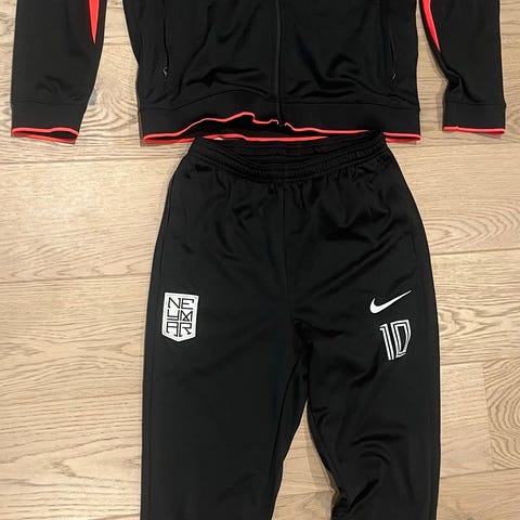 Nike Neymar fotball jakke for barn i størrelse 158-170cm. Jakken er i svart med røde detaljer. Jakken har hel glidelås og høy krage. Egnet for fotball og trening. Mulig å kjøpe hele settet, annonsen ligger på siden min.
