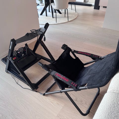 Playseat Challenge selges grunnet oppgradering. Flott rig som har fungert ypperlig med både Moza R5 og Logitech G29. Rig er oppgradert med 3D printet brakett som stiver opp stativ til pedaler. Har også fått laget brakett til girspak som passer til bla Moza HGP, denne kan følge med for 500kr ekstra, ellers følger brakett for girspak til Logitech G27/29/920/923 serien med gratis. Kan slåes sammen og stues bort når den ikke er i bruk.
